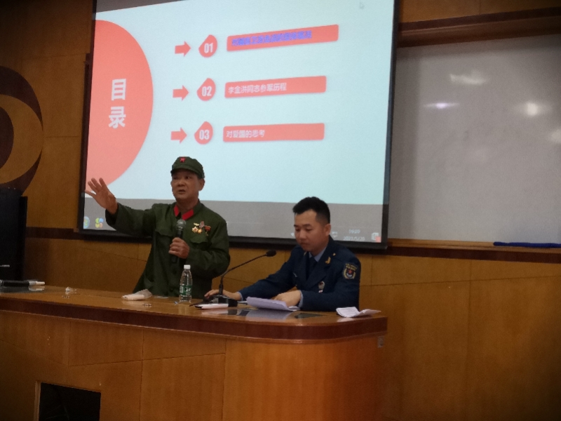 李金洪與陳偉樂兩代退役軍人同臺(tái)講述崢嶸歲月。 由于身體不適,李金洪無法長時(shí)間親述那段崢嶸歲月,但是這位老兵又是那么熱心地想讓更多后輩知道祖國的不容易,人民當(dāng)今幸福生活的來之不易,毅然接受邀請,克服身體不適,再次走上講臺(tái),結(jié)合親身經(jīng)歷給在場師生講述1979年那段崢嶸歲月。李金洪表示,軍人的使命是保衛(wèi)祖國,抵抗侵略,“如果再給我選擇的機(jī)會(huì),我還是義無反顧上戰(zhàn)場,我們有偉大的共產(chǎn)黨、有偉大的制度、有偉大的祖國和人民,我們應(yīng)該為自己是一名中國人和生活在祖國的大地上感到驕傲和自豪”。 此次宣講活動(dòng)中,李金洪多了一個(gè)戰(zhàn)友,他叫陳偉樂,是駐香港部隊(duì)的退役軍人,也是神灣鎮(zhèn)退役軍人服務(wù)中心的工作人員,李金洪和陳偉樂雖然是不同時(shí)代的退役軍人,但是有著同一個(gè)方向,就是對黨、祖國和人民無限的愛。李金洪身體不適,陳偉樂就來充當(dāng)他的“傳聲筒”,將一段段難忘經(jīng)歷分享給廣大師生們。