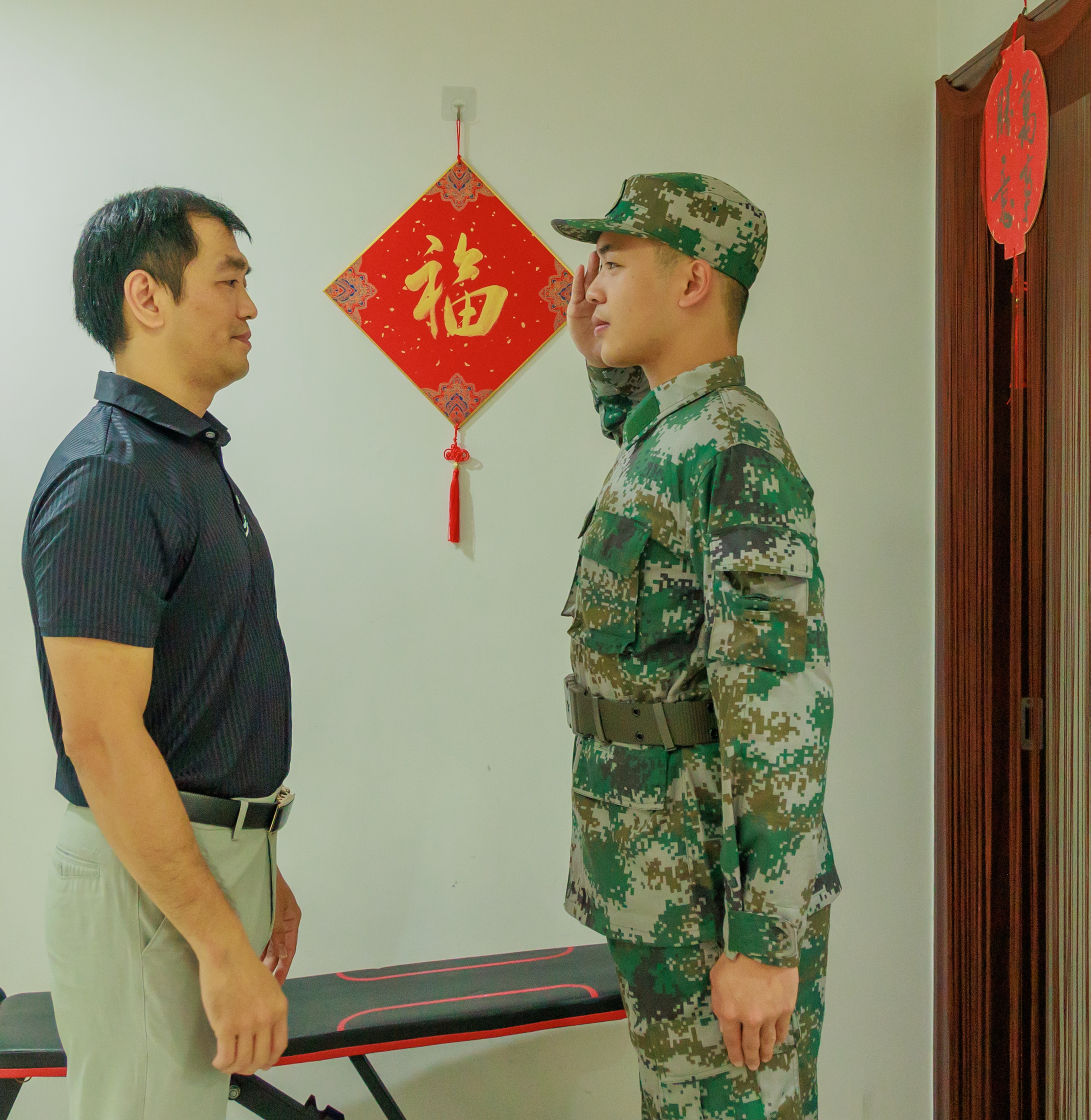 “我將把五彩的夢(mèng)想交給迷彩去儲(chǔ)藏……”9月8日,中山市東區(qū)街道舉行2023年下半年入伍青年歡送座談會(huì),新兵代表?xiàng)钌辛丶?dòng)地說。楊尚霖現(xiàn)已領(lǐng)取入伍通知書,并前往中山市國(guó)防教育基地開展役前訓(xùn)練,幾天后將啟程前往部隊(duì)服役。 楊尚霖給父親敬禮。馬衛(wèi)星 攝