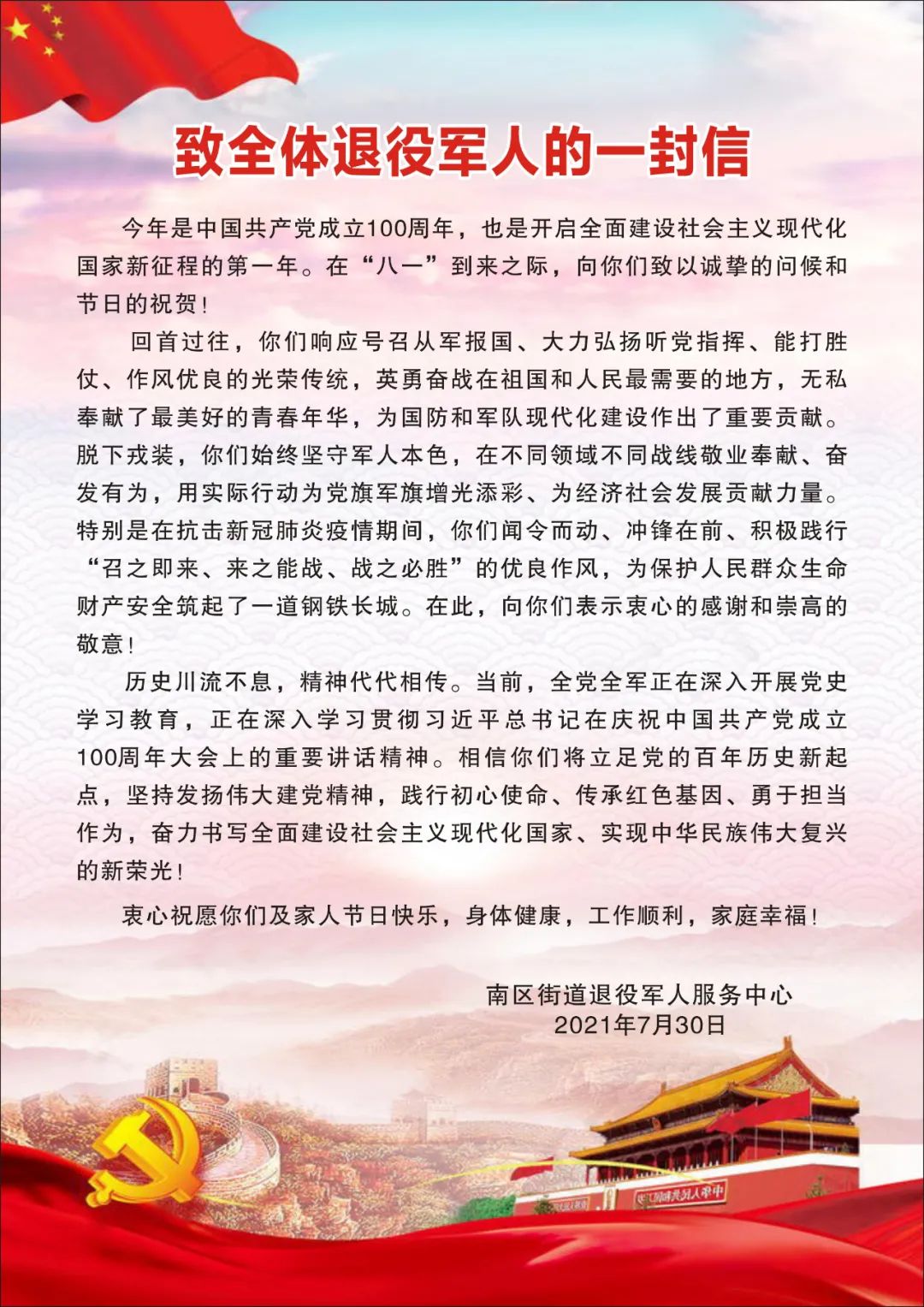 在“建軍節(jié)”來臨之際,南區(qū)街道開展一系列擁軍優(yōu)屬活動,懷著崇敬之心、感恩之心,向優(yōu)撫對象和退役軍人、現(xiàn)役軍人家屬表達關(guān)懷和謝意,推動軍民共建!