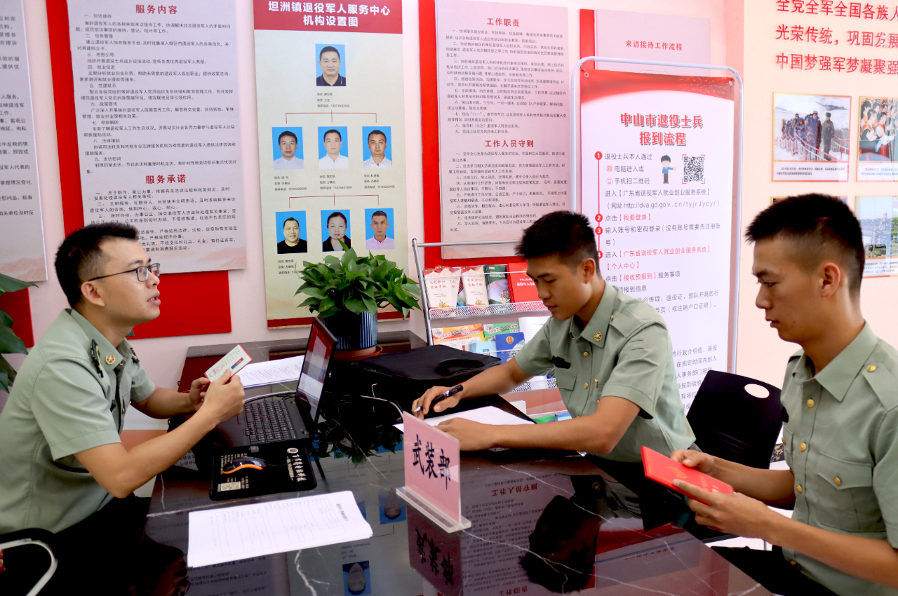 退役士兵返鄉(xiāng)前夕,坦洲鎮(zhèn)退役軍人服務(wù)中心就提前建立坦洲鎮(zhèn)2021年秋季退役士兵報(bào)到微信群,退役士兵加群后可查閱相關(guān)政策及業(yè)務(wù)事項(xiàng)、通知及信息,有疑問提出的話工作人員在群內(nèi)第一時(shí)間回復(fù)和解答問題。為簡化報(bào)到流程、提高效率,讓退役士兵少跑路,坦洲鎮(zhèn)公共服務(wù)辦公室積極謀劃,與人民武裝部聯(lián)合辦公,派出工作人員進(jìn)駐鎮(zhèn)退役軍人服務(wù)中心辦理預(yù)備役登記手續(xù)并做好相關(guān)政策宣傳及解釋工作。預(yù)備役登記手續(xù)辦結(jié)后,由退役軍人服務(wù)中心依次辦理報(bào)到登記、信息采集、組織關(guān)系轉(zhuǎn)接,并在政務(wù)服務(wù)大廳設(shè)立專窗辦理醫(yī)、社保接續(xù),在公安分局設(shè)立專窗辦理戶口落戶、換領(lǐng)身份證等服務(wù)保障項(xiàng)目。讓退役士兵享受方便快捷的報(bào)到服務(wù),體會“家”的溫馨。