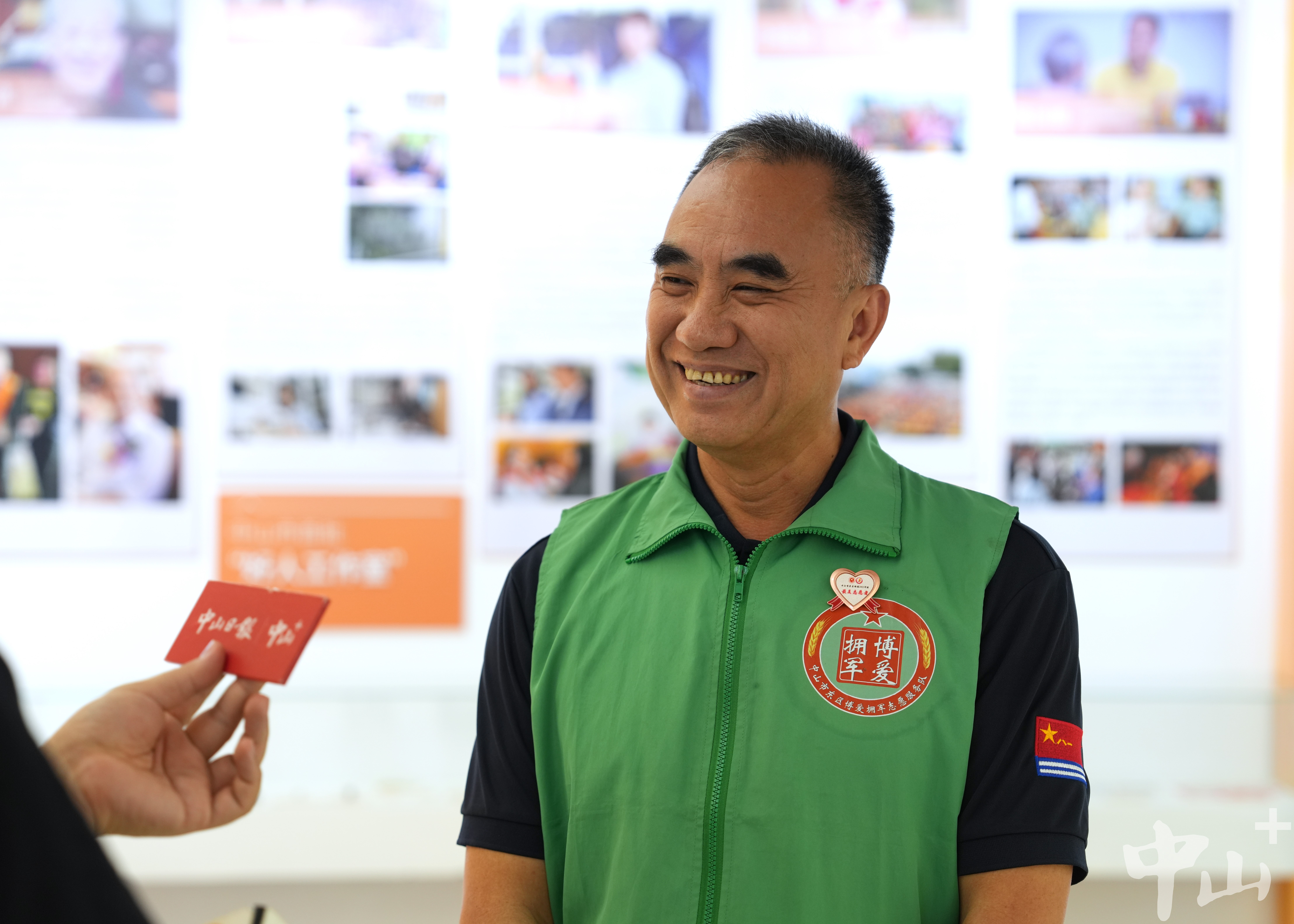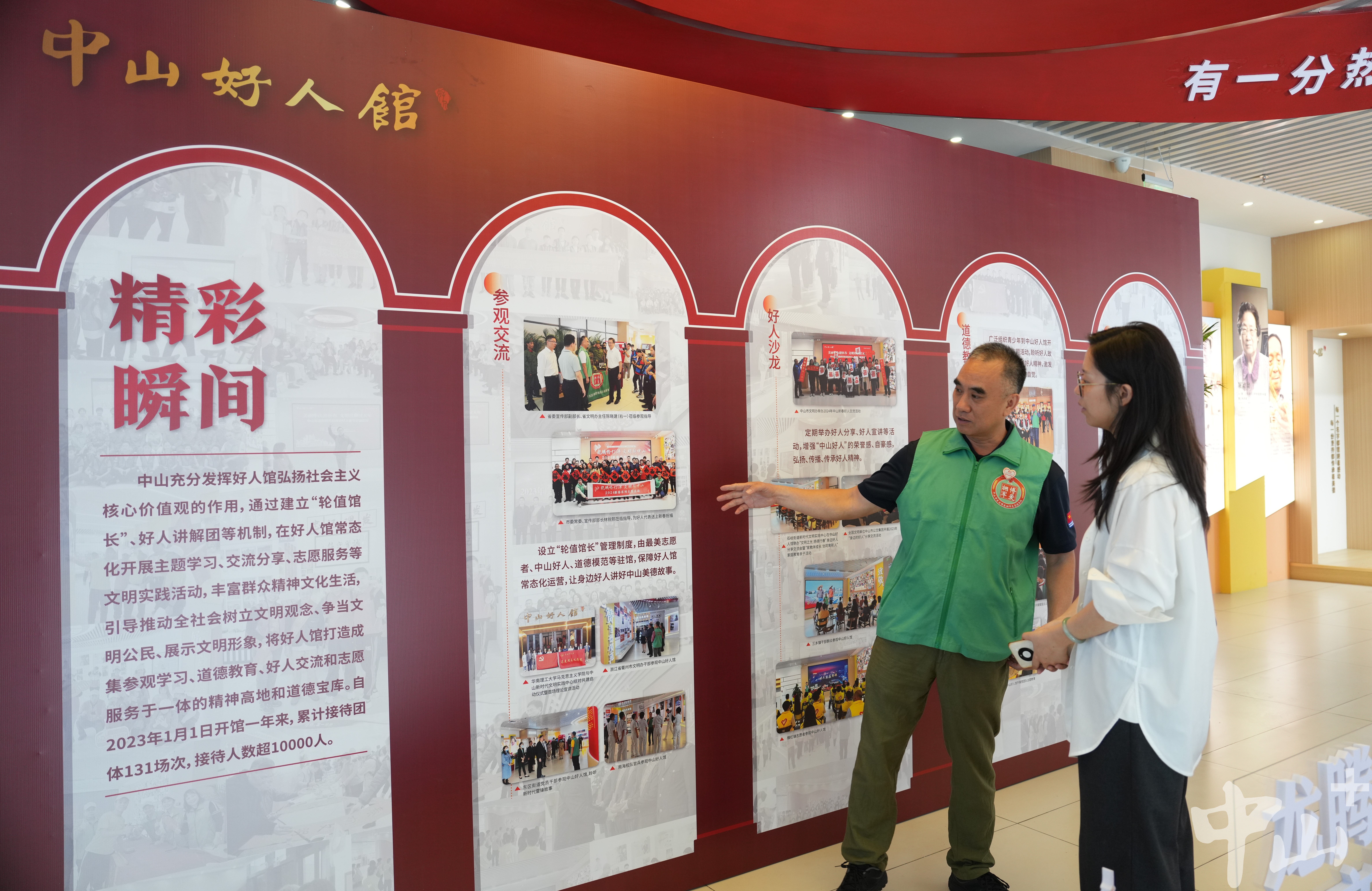 作為一名退伍軍人,李克有很多曾一起在戰(zhàn)場上出生入死的戰(zhàn)友,其中不乏已經(jīng)為國捐軀的烈士。自2007年起,他便自發(fā)組織尋找犧牲的中山籍戰(zhàn)友,先后6次帶隊(duì)前往廣西邊境的多個(gè)烈士陵園,成功尋到29名犧牲戰(zhàn)友信息,并將相關(guān)信息報(bào)送給中山市退役軍人事務(wù)局。 “我有一位戰(zhàn)友,寧愿把生的希望留給其他人,19歲不到就犧牲在戰(zhàn)場上。他們已經(jīng)離我們而去,更重要的是我們能為他們做些什么。所以逢年過節(jié)我都會(huì)看望他們的家人,把歡樂也帶給老人家?!崩羁苏f。 2016年,得知戰(zhàn)友的女兒患先天性心臟病,須進(jìn)行心肺聯(lián)合移植手術(shù),李克立即帶頭捐款,并聯(lián)系政府相關(guān)部門和電視臺(tái),通過媒體報(bào)道讓更多愛心人士關(guān)注到了這位困難老兵。在他的多方奔走下,社會(huì)各界紛紛伸出援助之手,募集醫(yī)藥費(fèi)40余萬元,助戰(zhàn)友的女兒順利完成了手術(shù)。 牽頭成立志愿服務(wù)隊(duì) 延續(xù)志愿精神 作為一名有著30多年志愿服務(wù)經(jīng)歷的資深志愿者,李克的生活已經(jīng)與志愿分不開。他的身上始終有一抹綠色:在軍營,是守衛(wèi)國門的綠軍裝;在社區(qū),是服務(wù)群眾的綠馬甲。在人民群眾需要的地方,李克每次都沖在最前線。 “2020年疫情暴發(fā)時(shí),很多人都響應(yīng)號(hào)召待在家里,我覺得作為一個(gè)打過仗的老兵,我總得站出來做點(diǎn)事?!睕]有過多考慮,李克第一時(shí)間加入到了志愿者隊(duì)伍中,并在社區(qū)堅(jiān)守了整整60天。當(dāng)時(shí)防護(hù)物資匱乏,李克還自掏腰包托人在廣州購買了6萬元左右的防護(hù)物資,全部捐贈(zèng)給了在一線抗疫的工作人員。 近年來,李克還積極捐資助學(xué)、支援災(zāi)區(qū)、扶危濟(jì)困,連續(xù)6年資助6名困難學(xué)生,為汕尾市陸河中學(xué)捐贈(zèng)10套多媒體電腦設(shè)備,堅(jiān)持參與無償獻(xiàn)血直到60歲。 2018年起,李克擔(dān)任文明城市巡查監(jiān)督員,奔走在街道各個(gè)路口、每條小巷,整理亂停亂放的共享單車,清理“牛皮癬”小廣告,保障街頭巷尾干凈衛(wèi)生。同一年,為更有組織地開展志愿活動(dòng),李克牽頭成立了一支以退役軍人為主導(dǎo)的東區(qū)博愛擁軍志愿服務(wù)隊(duì),把戰(zhàn)友們凝聚在一起,共同為社會(huì)作貢獻(xiàn)。如今,這支志愿服務(wù)隊(duì)已從最初的8名成員,逐漸壯大至400多人,成為服務(wù)社會(huì)的一支生力軍。 講好好人故事,傳承紅色文化 4月19日上午,記者在“中山好人館”見到了正在擔(dān)任“輪值館長”的李克。從去年1月開始,他每個(gè)月都參與輪值,先后為140多場活動(dòng)、1萬多名市民群眾義務(wù)講解博愛之城的凡人善舉、好人大愛。  正在中山好人館輪值的李克。記者 劉萬杰 攝