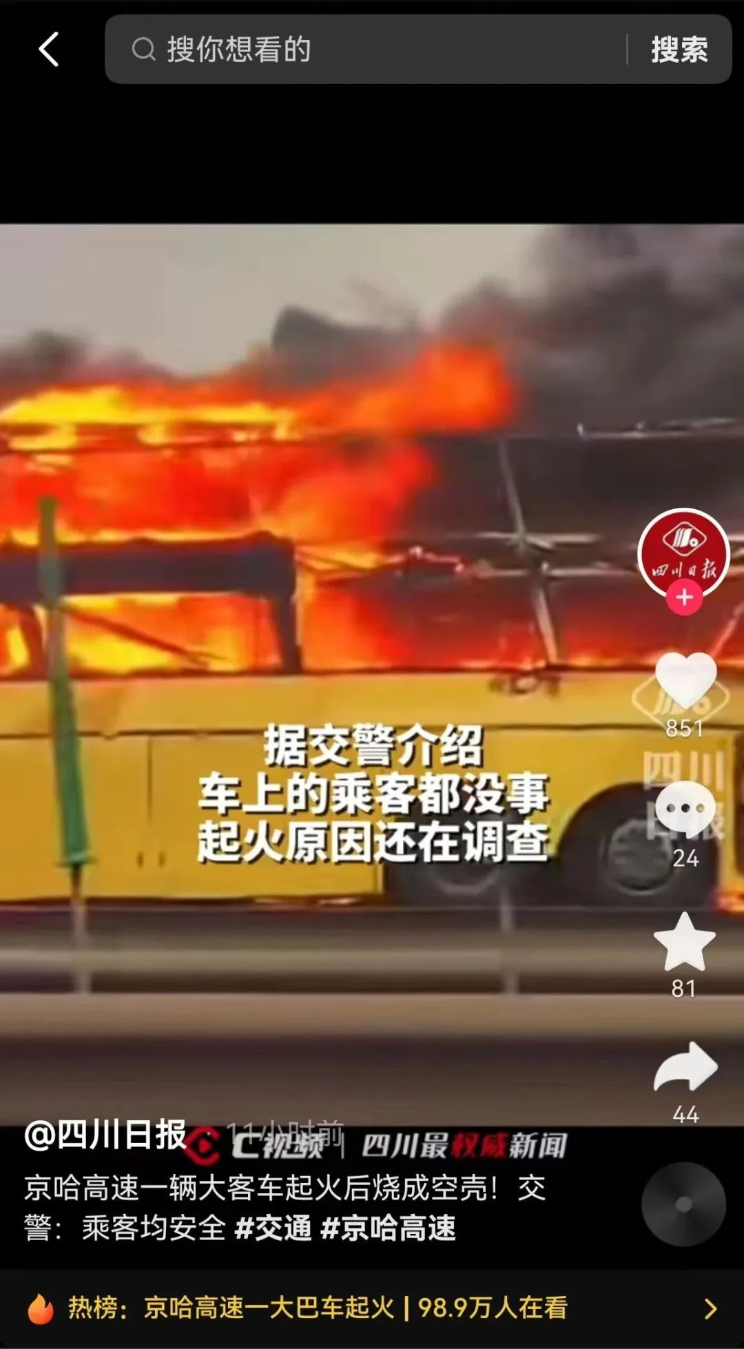 “重慶辟謠”搜索發(fā)現(xiàn),網(wǎng)傳視頻實為2月20日下午遼寧省葫蘆島市綏中縣京哈高速一輛大客車起火后被燒成空殼的畫面。當?shù)亟痪块T回應(yīng)稱現(xiàn)場火已撲滅,無人員傷亡。網(wǎng)傳信息為不實信息,相關(guān)自媒體賬號故意將視頻標注為重慶,誤導(dǎo)網(wǎng)友。