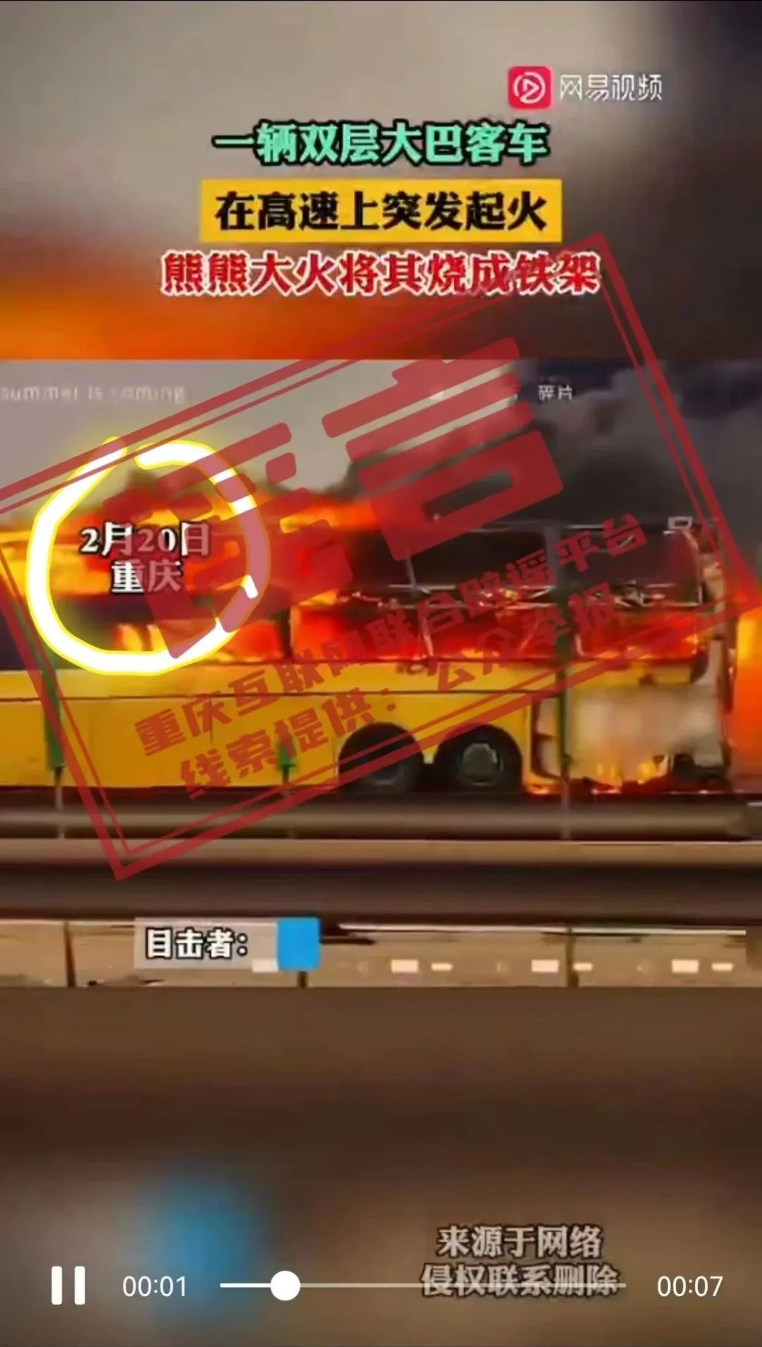 網(wǎng)傳視頻顯示高速上一輛大客車正燃著熊熊烈火,視頻配文稱“一輛雙層大巴客車在高速突發(fā)起火,熊熊大火將其燒成鐵架”,并在顯著位置標示“2月20日 重慶”。