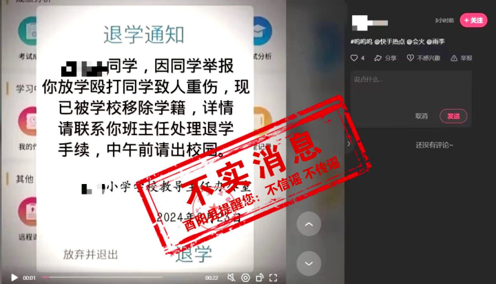 無獨(dú)有偶,近期重慶酉陽縣某小學(xué)一學(xué)生也對這則謠言進(jìn)行“模仿秀”,在網(wǎng)上惡搞“克隆”出“退學(xué)通知”,并以學(xué)校名義署名落款。相關(guān)謠言在網(wǎng)上傳播后引發(fā)議論。前,這則謠言已被刪除,學(xué)校對該學(xué)生進(jìn)行了批評教育。