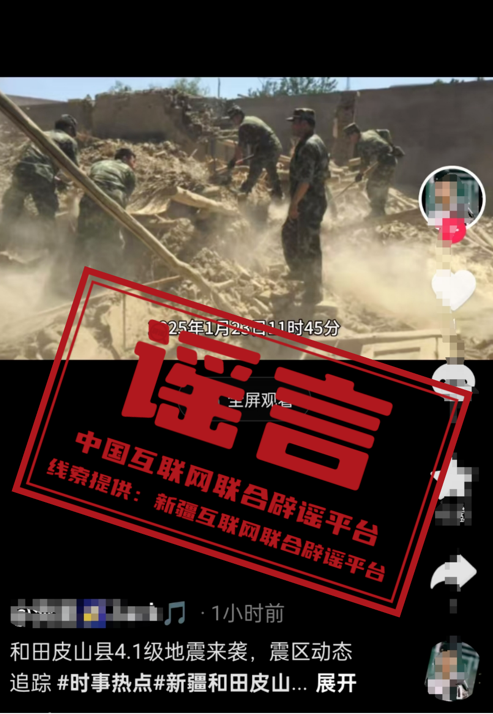 謠 言 新疆和田地區(qū)皮山縣地震造成房屋倒塌、道路坍塌?