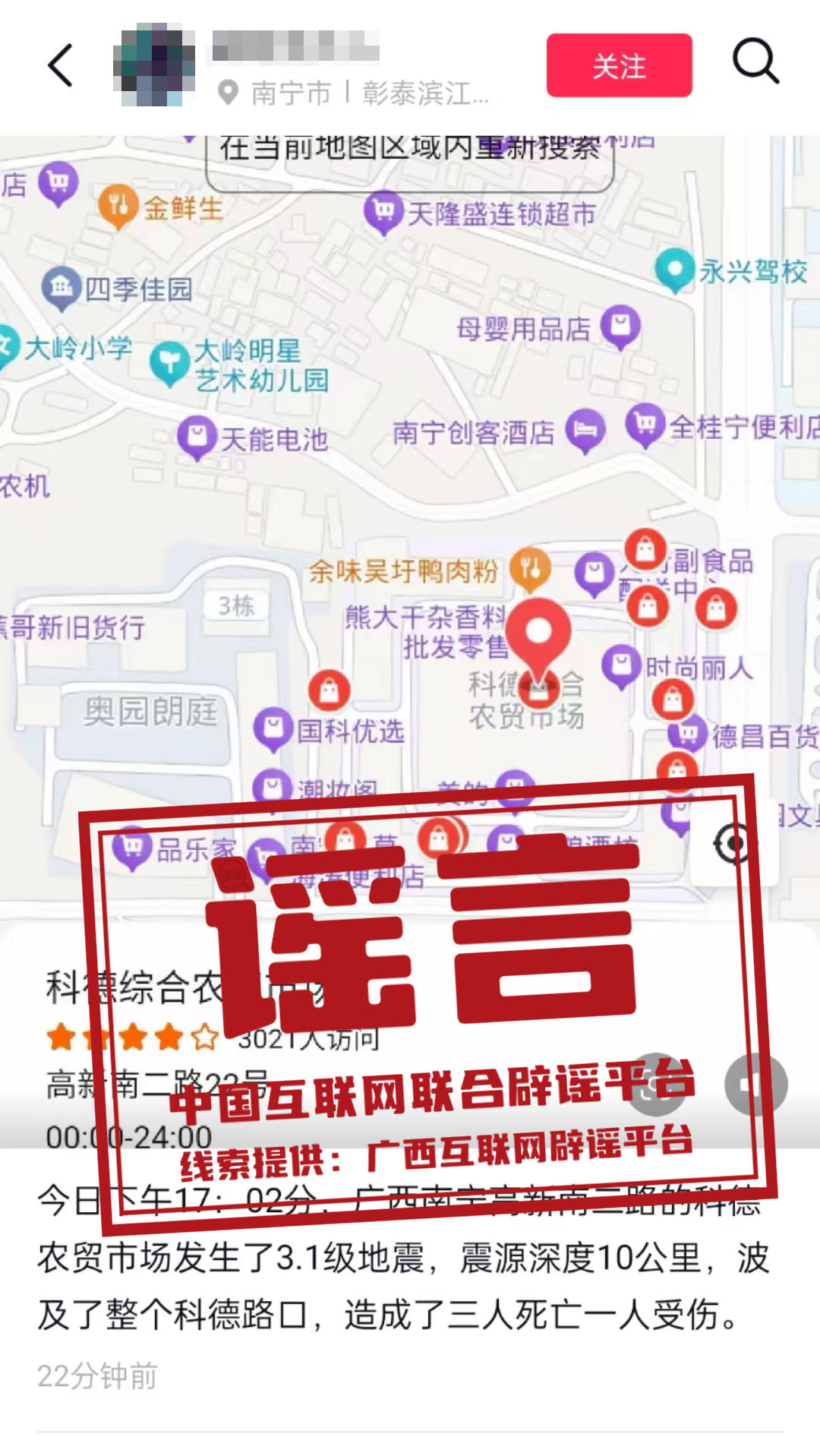 真相:2月12日,有網(wǎng)民在某短視頻平臺(tái)發(fā)文稱“今日下午17:02分,廣西南寧高新南二路的科德農(nóng)貿(mào)市場(chǎng)發(fā)生了3.1級(jí)地震?!苯?jīng)向有關(guān)部門核實(shí),此信息為謠言。據(jù)廣西地震臺(tái)網(wǎng)和南寧市地震監(jiān)測(cè)中心數(shù)據(jù)顯示,南寧市及其鄰區(qū)無(wú)有感地震發(fā)生,亦無(wú)震情和災(zāi)情信息反饋。目前,謠言線索已轉(zhuǎn)交相關(guān)部門對(duì)造謠者進(jìn)行進(jìn)一步調(diào)查處置。(來(lái)源:“廣西互聯(lián)網(wǎng)違法和不良信息舉報(bào)”微信公眾號(hào)、南寧市互聯(lián)網(wǎng)舉報(bào)·辟謠平臺(tái))