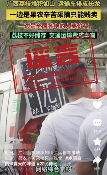 真相:6月12日,網(wǎng)傳“近日廣西荔枝堆積如山,運(yùn)輸車排成長(zhǎng)龍。果農(nóng)辛苦采摘只能賤賣”的視頻,畫面顯示荔枝堆積和“靈山荔枝1元”字樣。經(jīng)核查,視頻內(nèi)容并非發(fā)生在靈山縣。目前,靈山荔枝“妃子笑”等中熟品種逐漸批量上市,大規(guī)模上市時(shí)間為6月20日左右,當(dāng)前荔枝產(chǎn)銷有序開展,并未發(fā)現(xiàn)個(gè)別媒體報(bào)道的“荔枝滯銷賤賣”“采摘堆積成山”“運(yùn)輸車排成長(zhǎng)龍”的情況,也沒有發(fā)現(xiàn)價(jià)格低到1元的荔枝出售。(來源:“廣西互聯(lián)網(wǎng)違法和不良信息舉報(bào)”微信公眾號(hào))